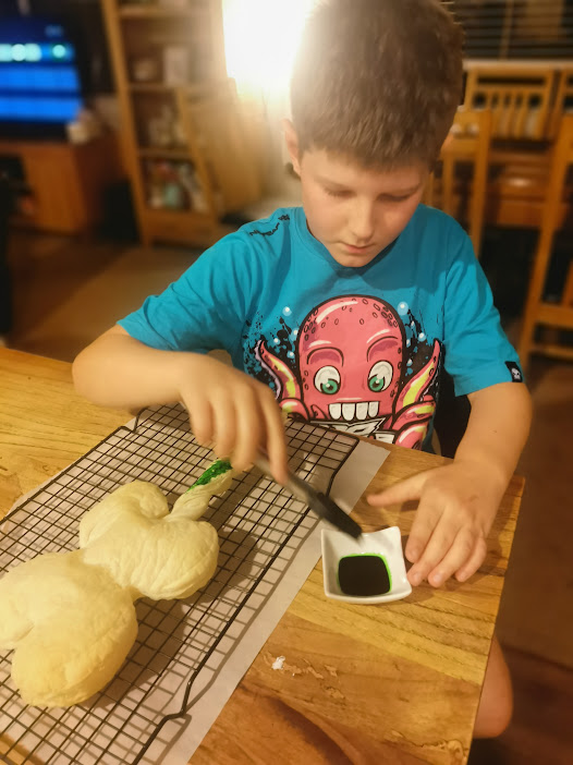 Today I was going to make some Anzac biscuits but we didn't have any oats so we made a poppy puff pastry with berries as the middle. Me and my mum dyed the stem green and put cream on the pastry before I put the berries on. My favorite part was licking the spoon, I mean everybody loves licking the spoon. Next time I would change how much berries we put on it.
